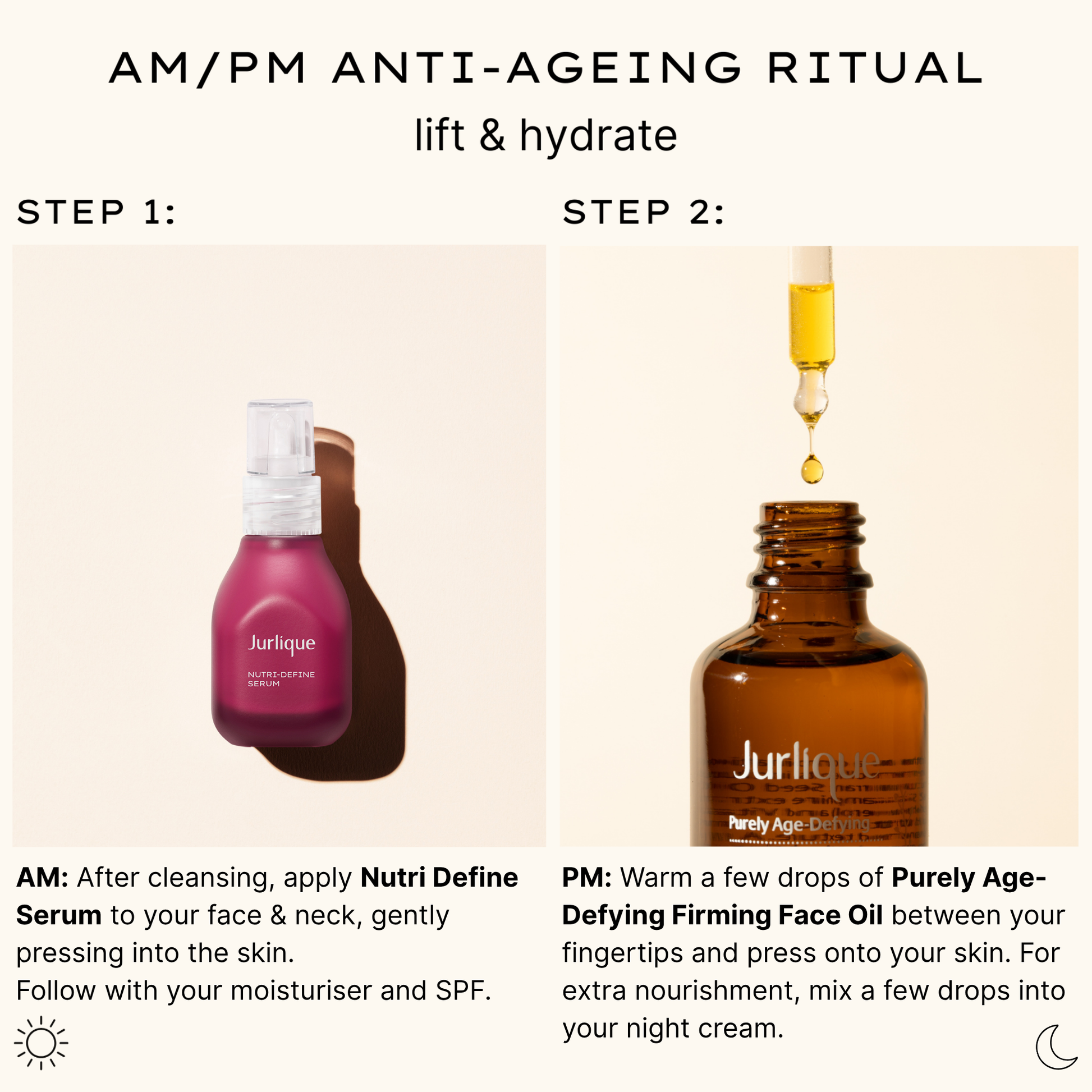 Lift & hydrate with Jurlique’s Anti-Ageing AM & PM Duo—Nutri-Define Serum for day & Purely Age-Defying Firming Face Oil for night.